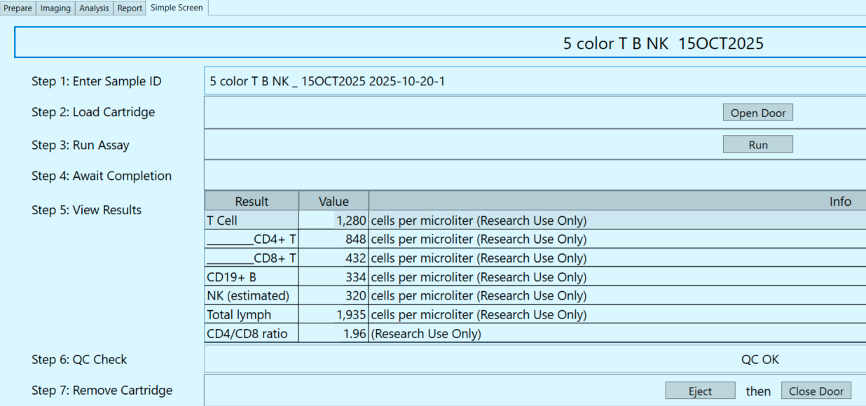 Reports T, B, NK, CD4, CD8 absolute counts